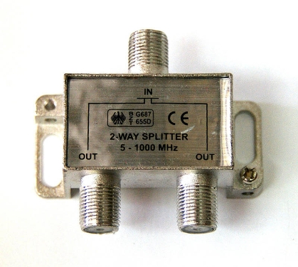 Сплиттер (разветвитель) с розетками под f-разъемы. Вход и выходы гальванически развязаны. Предназначен для разветвления высокочастотных (5-1000МГц) телевизионных (RF/AV/TV) сигналов с одного источника на 2 направления. Без штекеров. F-разъем представляет из себя оголенную жилу, входящую в гнездо, чаще всего для удобства имеющая защитное резьбовое соединение (гайка).