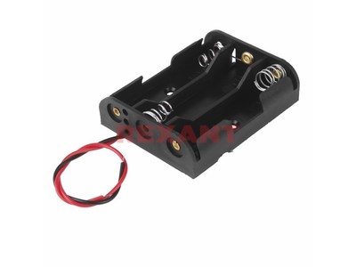 Батарейный отсек (держатель батареек) для трех батарей типоразмера АА с контактными проводами предназначен для подключения питания в различном оборудовании (в том числе в бытовых устройствах, игрушках и радиоуправляемых моделях). В целях ускорения и удобства монтажа держатель выполнен с двумя проводами (красного и черного цвета) длиной по 13 см, т. е. не требует пайки контактов. Окончания проводов подготовлены для дальнейшего монтажа: зачищены и обложены оловом. Суммарное напряжение при использовании 3 батареек на 1.5 В составит 4,5 В.