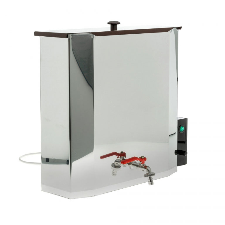 Внутрь бака встроен нагревательный элемент (ТЭН) с термостабилизатором, который поддерживает постоянную температуру в пределах 55 градусов, максимальная температура нагрева – 60 градусов. Время нагрева – 60 минут. Емкость крепится к стене или к каркасу умывальника Мойдодыр над раковиной. Электропровод, идущий от блока терморегулятора включается в розетку. Устройство легкое и компактное, вес примерно 1 кг.