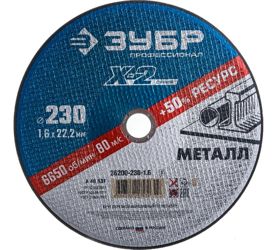 Круг отрезной 230х1,6х22,2 Зубр предназначен для угловых шлифовальных машин и ручных резчиков. Применяется для резки металлических деталей и заготовок, чугунного литья, строительной арматуры и других материалов. Круг оснащен двуслойным армированием полиамидными сетками. Абразивная составляющая - оксид алюминия до 98%. Связующее вещество изготовлено на основе быстросохнущих спиртовых синтетических смол с полным отсутствием содержания серы и хлора.