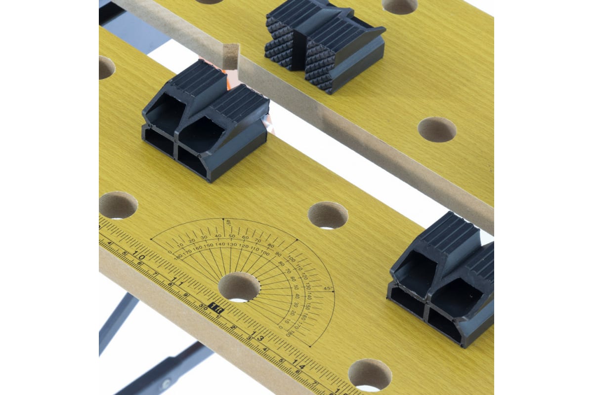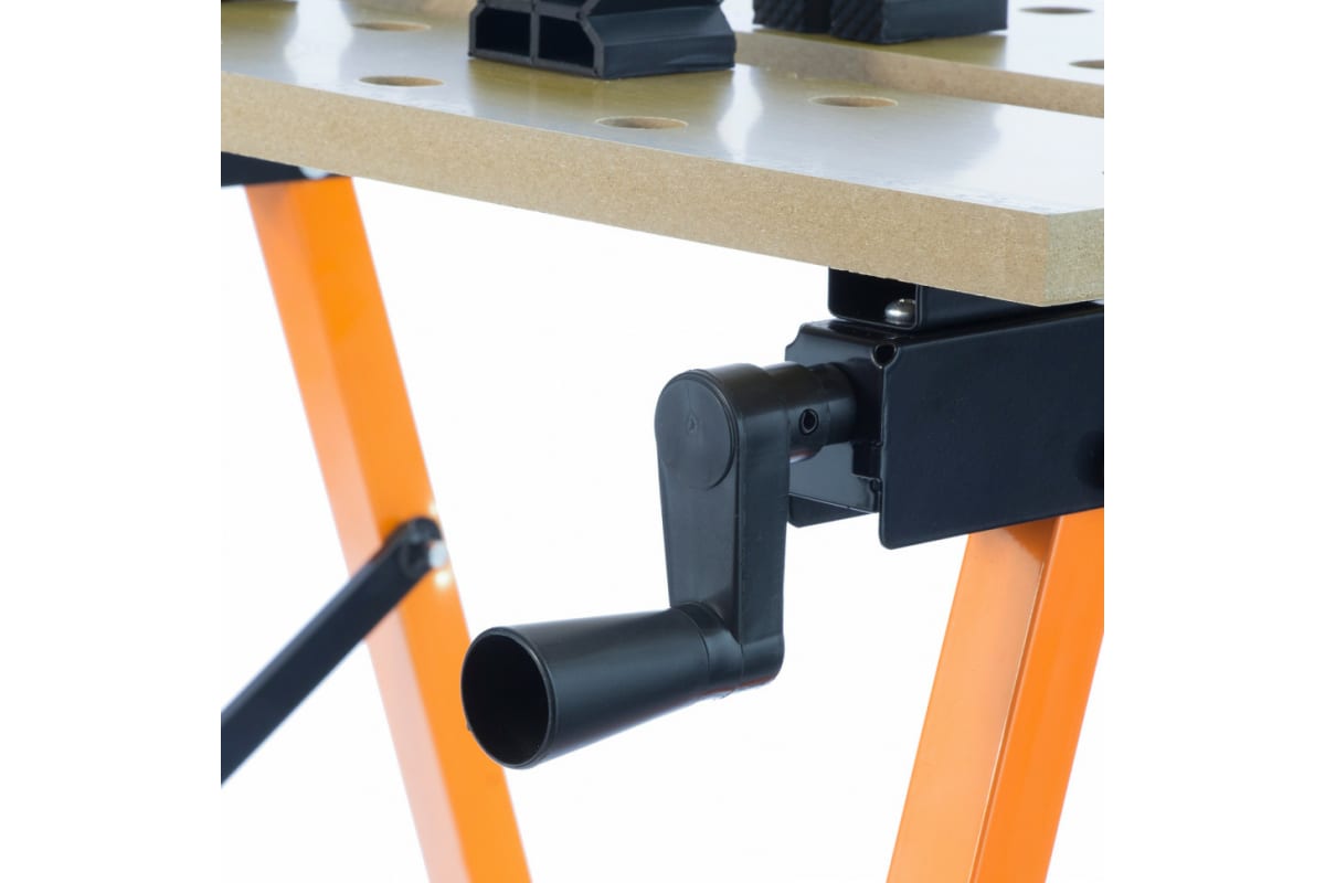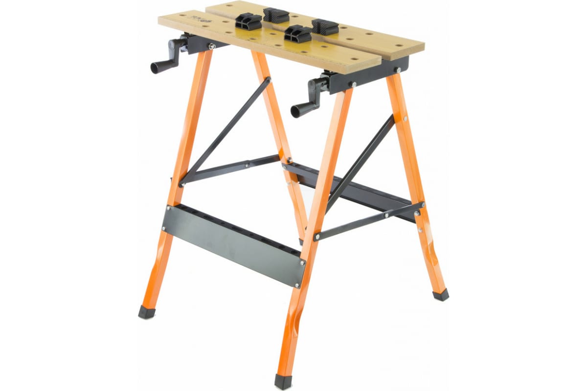 Верстак-тиски SPARTA 257055 применяется в небольших ремонтных мастерских. Столешница изготовлена из МДФ, что гарантирует устойчивость к нагрузкам до 100 кг. Благодаря складной конструкции изделие отличается удобством хранения и транспортировки. Тиски позволяют надежно фиксировать заготовки для их дальнейшей обработки.