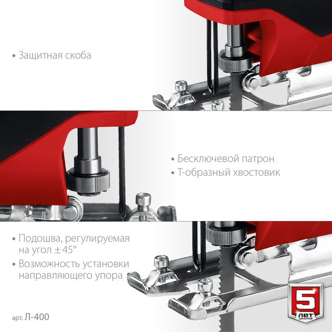 Лобзик электрический Зубр Л-400, 400 Вт, пропил 55 мм предназначен для домашних мастеров. Подходит для пиления древесины, фанеры, ДСП, пластика, металла (при наличии соответствующей оснастки). Быстрозажимной патрон позволяет производить замену полотна без вспомогательных принадлежностей. Электронная регулировка частоты хода в широком диапазоне помогает подобрать оптимальный режим в зависимости от задачи.