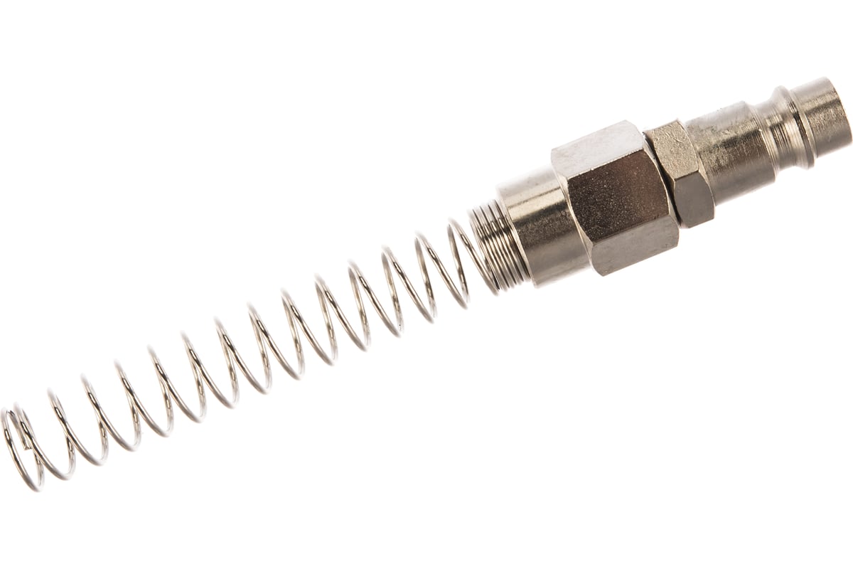Переходник FUBAG 180170 предназначен для работы с компрессорами и обеспечивает соединение шланга с пневмоинструментом. На одном конце фитинга установлен рапид папа, а на другом — пружина диаметром 6.5 мм и длиной 10 мм. Эта пружина предотвращает перегибы и деформации шланга в месте соединения. Конструкция отличается высокой прочностью и герметичностью.