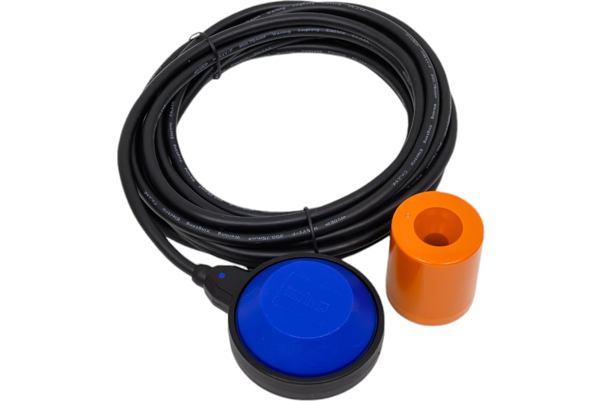Поплавковый выключатель предназначен для автоматического включения / выключения электрического насоса, в зависимости от уровня воды. В зависимости от схемы подключения, поплавок-переключатель может срабатывать как на включение, так и на выключение насоса. Устройство: Поплавковый выключатель состоит из плавающей пластиковой коробки. Внутри этой коробки находится электрический переключатель и стальной шарик, который при изменении положения поплавка замыкает (или размыкает) контакты переключателя. От переключателя выходят кабель с тремя проводами (обычно это коричневый, синий и черный цвета): один общий и два от нормально закрытого и нормально открытого контактов переключателя. Максимальный ток для реактивной нагрузки (электродвигатели насосов), А4 Максимальный ток для активной нагрузки (лампы, тэны, пускатели), А10, Сечение кабеля: 3х 0,75мм²