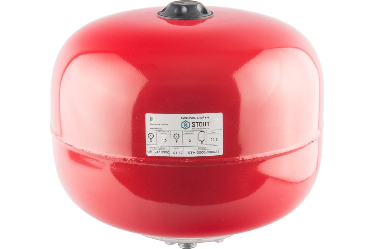 Бак расширительный 24 л вертикалный STOUT используется для компенсации температурного расширения в системе и стабилизации давления, сглаживания колебаний давления и компенсации гидравлических ударов в системах отопления с температурой теплоносителя до 100ºС.
