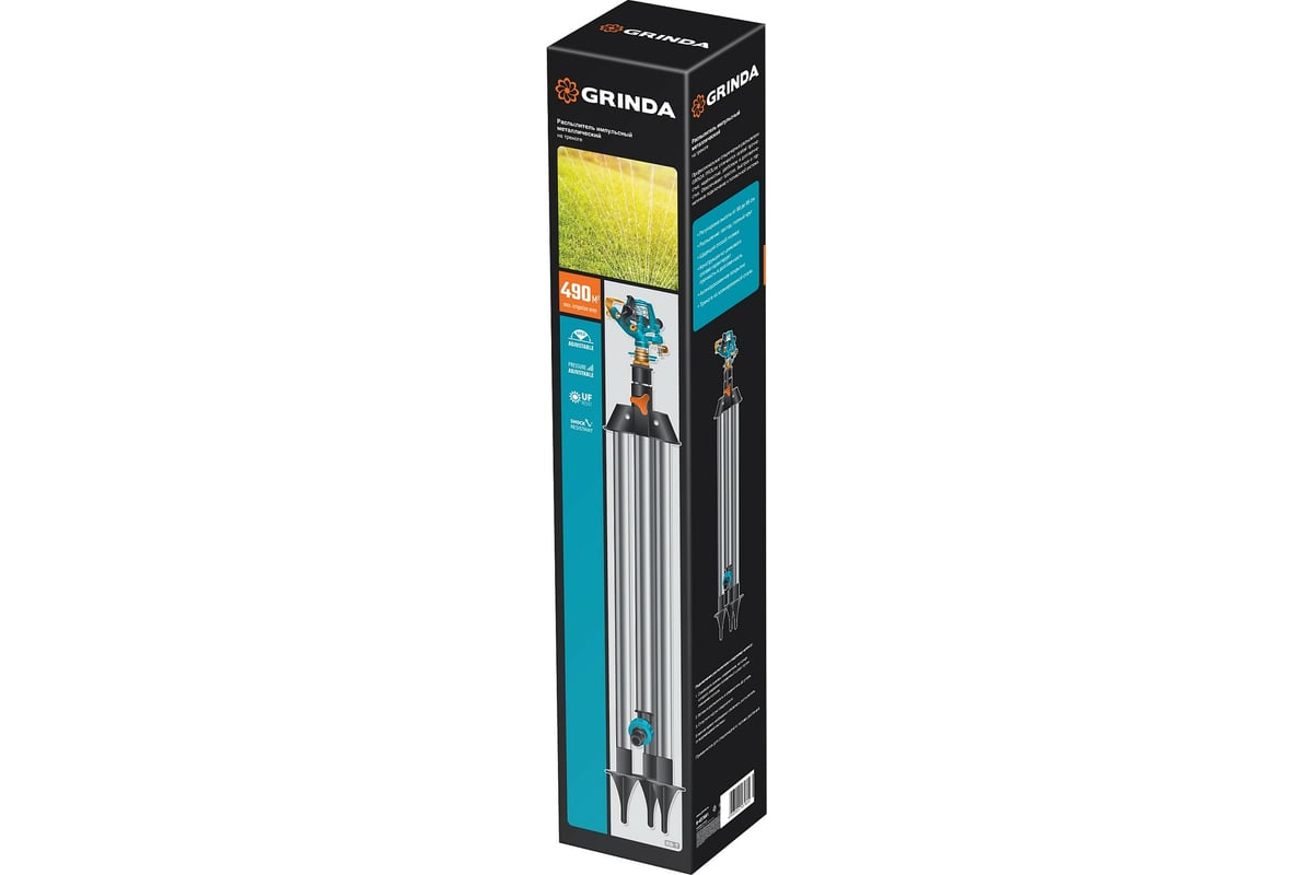 Металлический импульсный распылитель на треноге Grinda PROLine RB-T 8-427661_z02 предназначен для стационарного полива насаждений на садовом и дачном участке площадью до 490 м2.