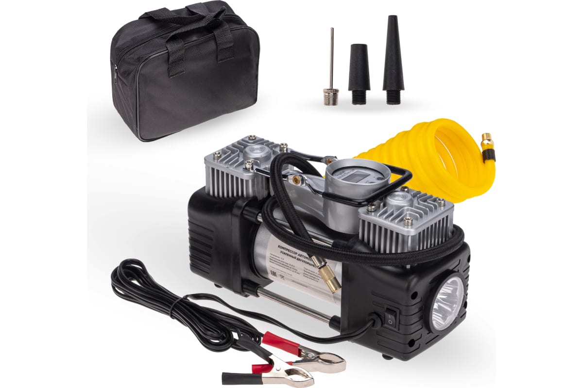 В комплекте поставляются переходники для накачивания мячей, матрасов, резиновых лодок. Особенности: функция автостоп; встроенный LED фонарь для подсветки; двухпоршневой механизм; защита от перегрева; можно использовать для больших колес.
