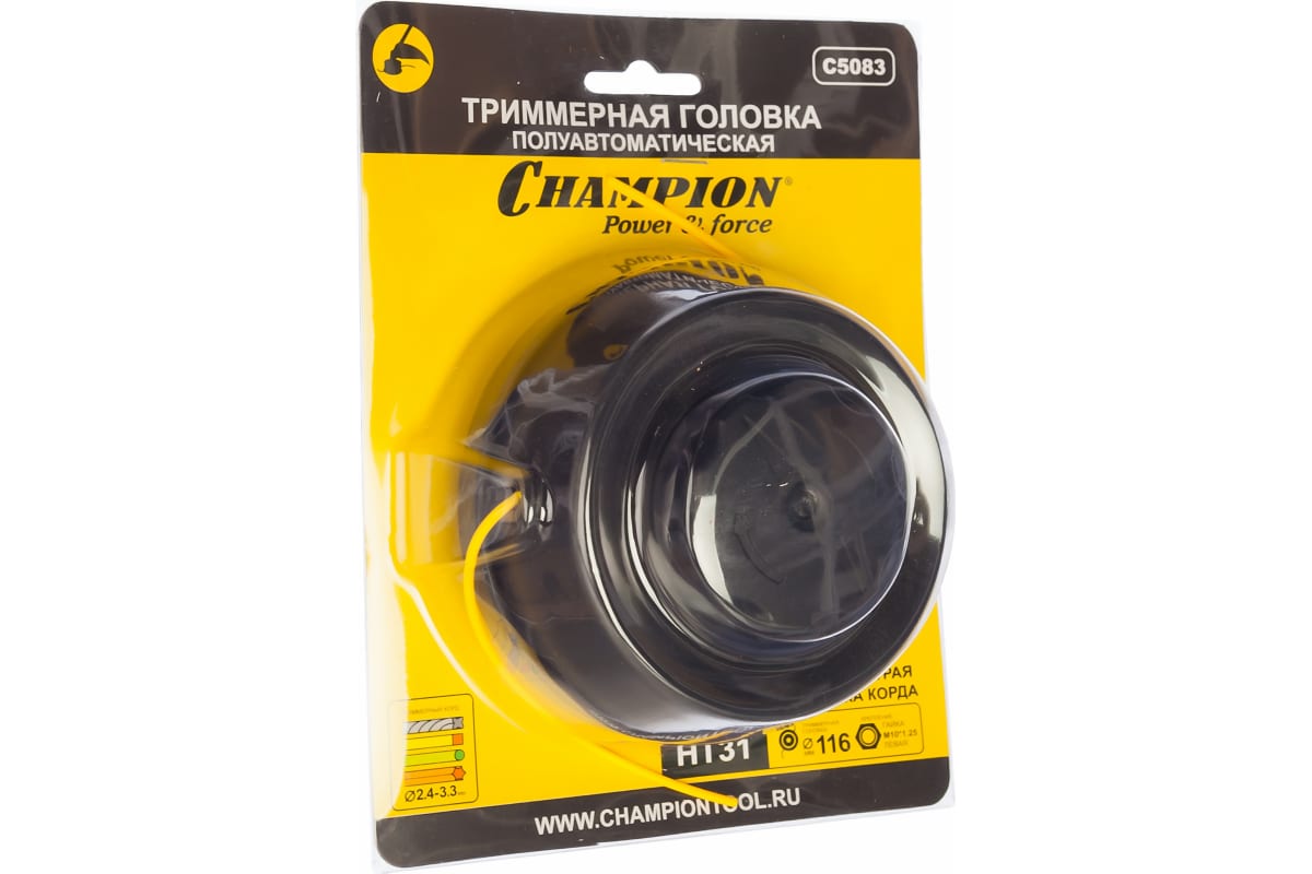 Головка HT31 CHAMPION C5083 подходит для триммеров Champion T233, T256, T263, T266, T333, T334FS, T336, T337, T436, T437, T516, T517, ET1004A, ET1200A. Используется для срезания любых видов травы. Данная триммерная головка является полуавтоматической, и подача лески из бобины осуществляется путем нажатия кнопки в нижней части катушки о землю прямо в процессе работы. За счет центробежной силы леска разматывается и выдвигается, а специальный нож на кожухе обрезает лишнюю леску, оставляя всегда одинаковую рабочую длину. Головка предусматривает выход лески с двух сторон. Функция быстрой загрузки корда позволяет наматывать леску на катушку, не отсоединяя от триммера. Нужно вставить леску необходимой длины в боковые отверстия катушки и аккуратно поворачивать до полного наматывания изделия.