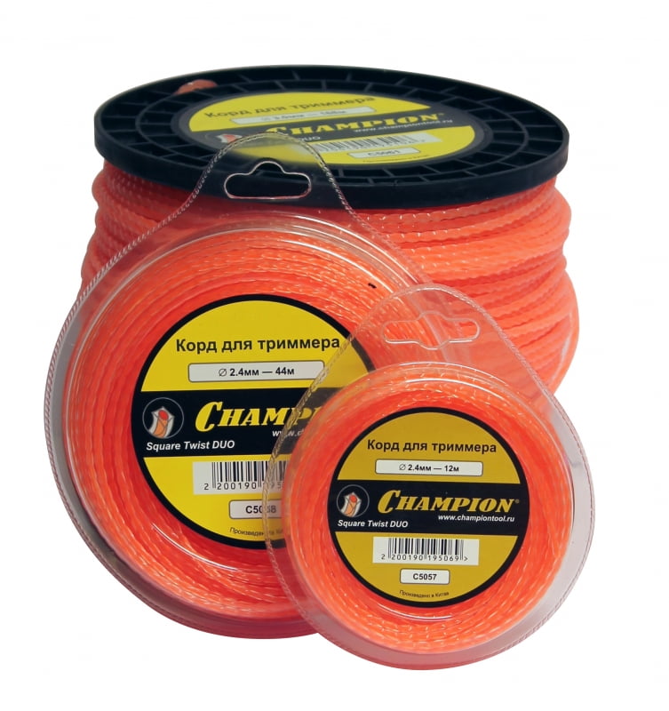 Корд триммерный Champion Square Twist DUO 2.0 мм х 15 м (витой квадрат) - с сечением витой квадрат, который имеет в своем составе два материала с различными физическими свойствами, внешняя оболочка (прозрачная) стойкая к абразивному износу, а сердцевина (оранжевая) обладает высокой стойкостью к обрывам.
