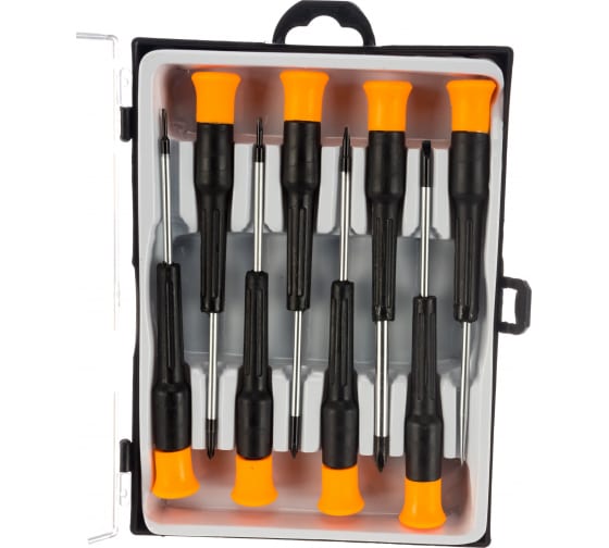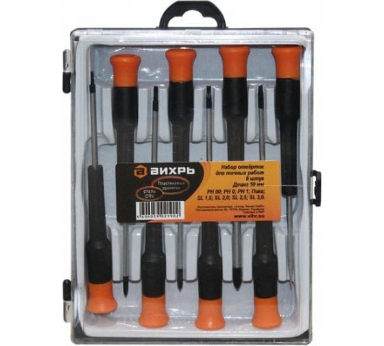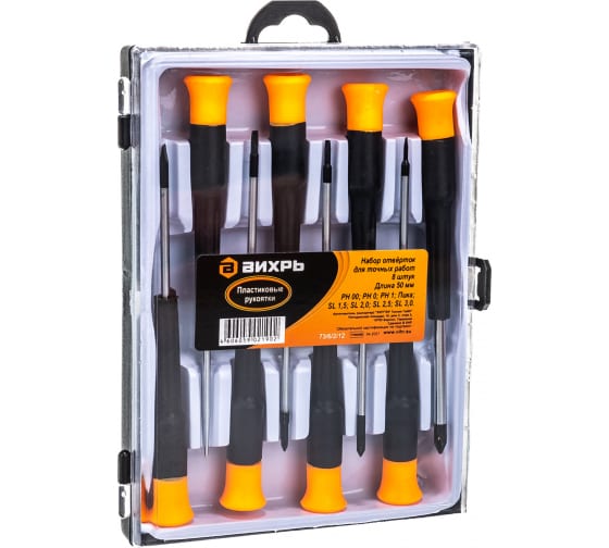 Набор отвёрток для точных работ «ВИХРЬ» предназначен для завинчивания и отвинчивания резьбовых соединений маленького размера. Отвертки из данного набора незаменимы при работе с электроникой, часами и прочими мелкими соединениями. Тыльная сторона отвертки оснащена поворотной шайбой. При помощи шайбы можно легко и быстро вращать инструмент простым перебором пальцев. Набор упакован в пластиковый бокс.