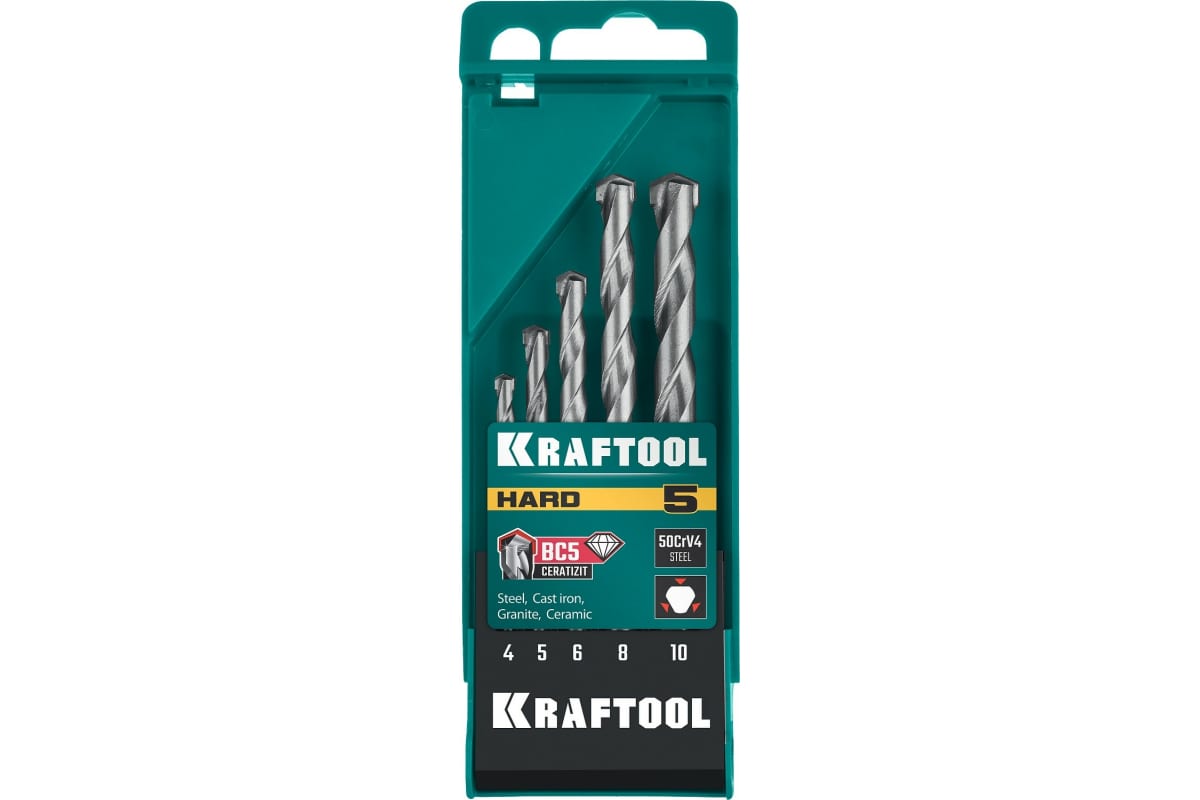 Набор сверл по твёрдым материалам 4-5-6-8-10 5шт KRAFTOOL HARD подходит для сверления быстрорежущих сталей, подшипниковой стали, чугуна, керамики, гранита, а также бетона и кирпича.