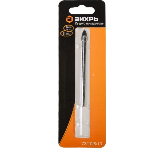Сверло по керамике и стеклу 6 мм «ВИХРЬ» предназначено для сверления отверстий в стекле, мраморе, керамической и кафельной плитке.