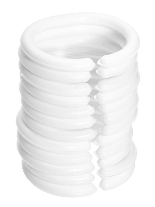 Набор из 12 пластиковых колец для крепления шторки для ванной комнаты на карниз. Кольца имеют продолговатую форму и вставляются в люверсы шторки.
