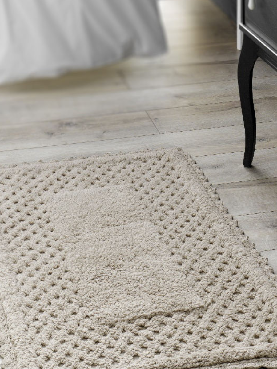 Вам хочется чего-то нежного, мягкого и красивого для ваших ног? Мягкие коврики из серии MARIA-это функциональность и уют в вашей квартире. Коврик 50х70 см изготовлен из 100% хлопка. Обратная сторона имеет ребристую поверхность и обработана противоскользящим латексным покрытием, которое со временем вымывается и рассчитано минимум на 50 циклов стирки. Коврик подходит для использования как в ванной комнате, так и в спальне в качестве прикроватного коврика, в гостиной у небольших журнальных столиков, можно использовать в детской комнате. Достоинства модели-это 100% натуральный и гипоаллергенный состав, отличная впитываемость влаги. За счет того, что коврик имеет натуральное латексное покрытие с обратной стороны, он не оставляет следов на кафеле, как коврики с резиновым покрытием, и препятствует появлению бактерий, так как нет постоянной влажности между полом и ковриком. Рекомендуем стирку при 40 градусах мягкими моющими средствами без использования кондиционера.