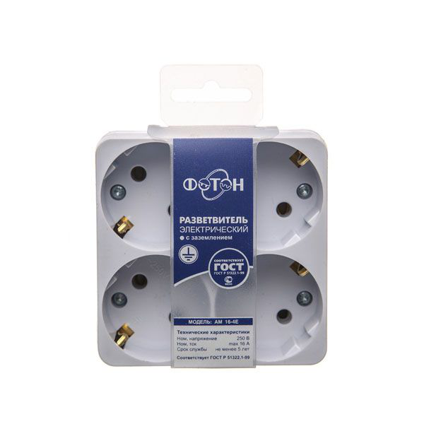 Разветвитель Фотон АМ 16-4Е представлен в классическом белом корпусе из ударопрочного пластика. Этот материал имеет малый вес и длительный срок службы. Конструкция дополнена заземляющим контактом.