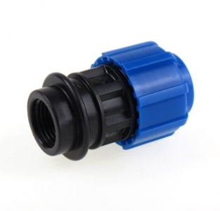 Муфта компрессионная с внутренней трубной резьбой. Предназначена, для возможности легкого перехода со стального трубопровода на трубопровод из ПНД труб, так как имеет резьбу соответствующую размерам и стандартам стальных трубных резьб. Кроме этого муфта компрессионная  с внутренней резьбой может учувствовать в строительстве различных комбинаций отводов и разветвлений с применением других компрессионных ПНД фитингов.
