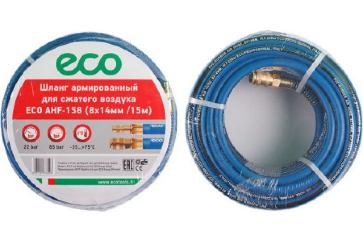 Шланг 8х14 мм, 10 м, ПВХ ECO AHF-108 оснащен быстросъемными соединителями и применяется для соединения пневматического инструмента с компрессорами и линиями подачи сжатого воздуха. Шланг оборудован латунными быстросъемными соединениями ПАПА и МАМА.