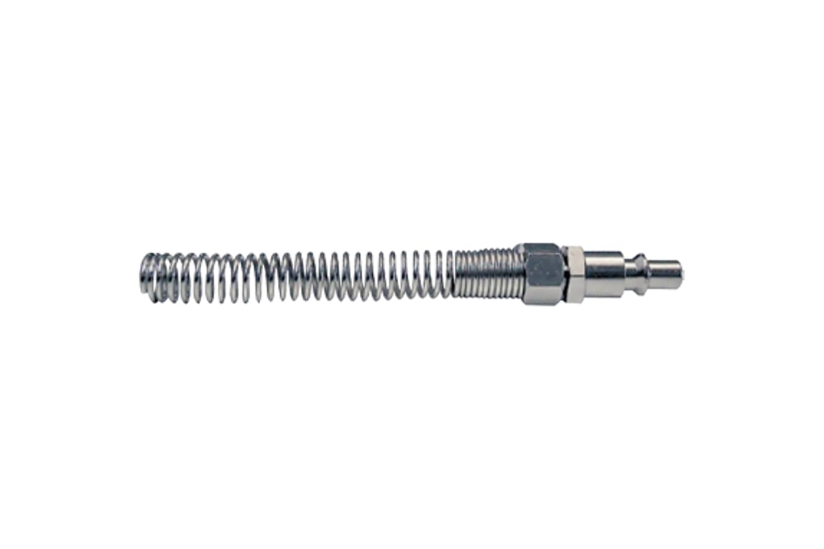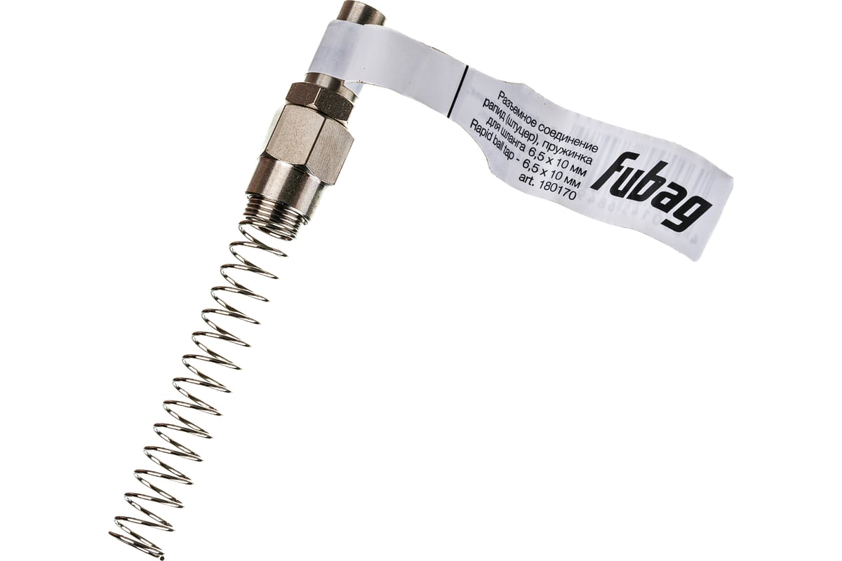 Переходник FUBAG 180170 предназначен для работы с компрессорами и обеспечивает соединение шланга с пневмоинструментом. На одном конце фитинга установлен рапид папа, а на другом — пружина диаметром 6.5 мм и длиной 10 мм. Эта пружина предотвращает перегибы и деформации шланга в месте соединения. Конструкция отличается высокой прочностью и герметичностью.