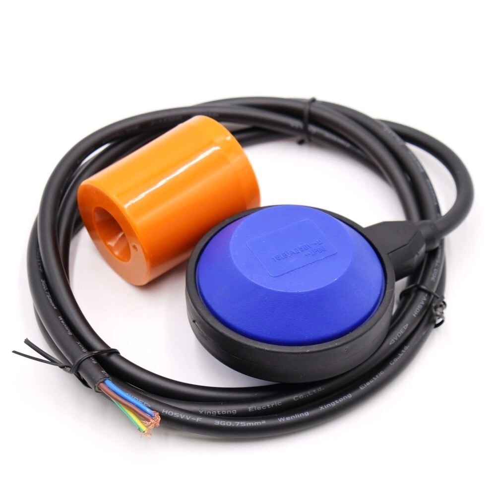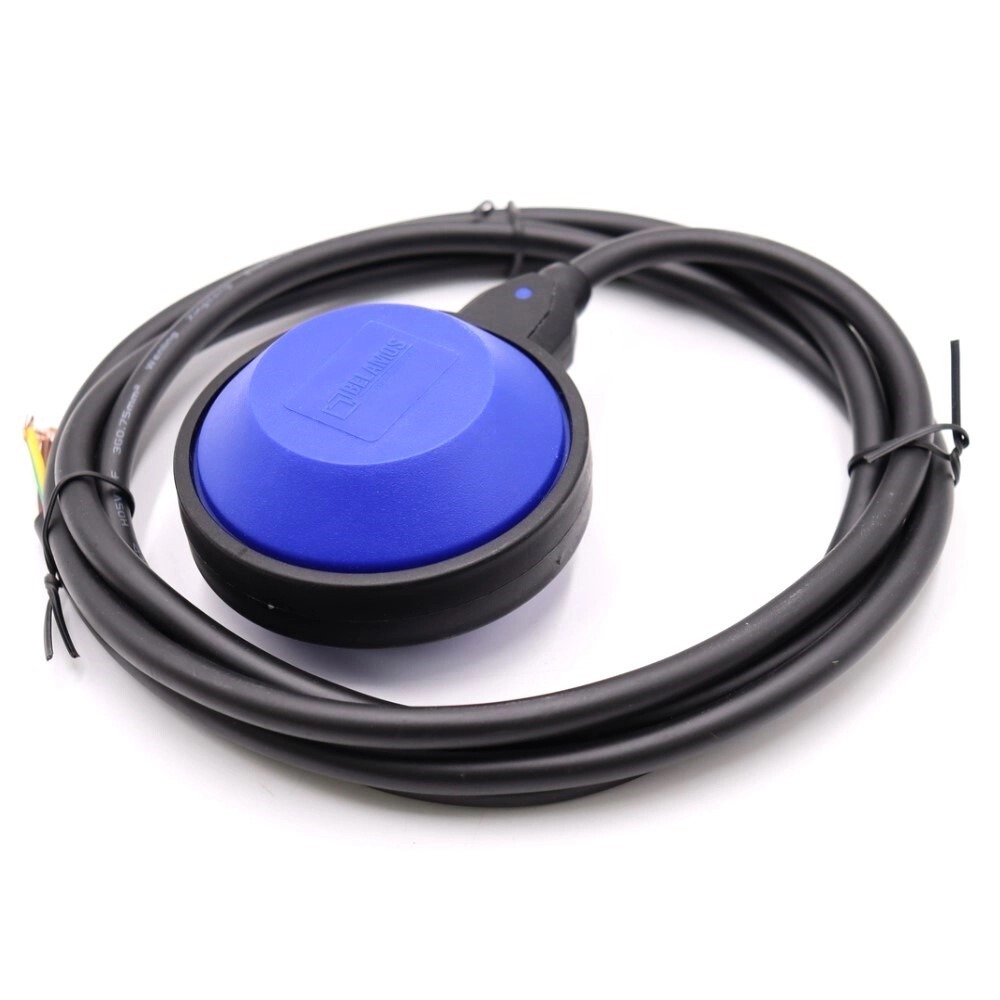 Поплавковый выключатель предназначен для автоматического включения / выключения электрического насоса, в зависимости от уровня воды. В зависимости от схемы подключения, поплавок-переключатель может срабатывать как на включение, так и на выключение насоса. Устройство: Поплавковый выключатель состоит из плавающей пластиковой коробки. Внутри этой коробки находится электрический переключатель и стальной шарик, который при изменении положения поплавка замыкает (или размыкает) контакты переключателя. От переключателя выходят кабель с тремя проводами (обычно это коричневый, синий и черный цвета): один общий и два от нормально закрытого и нормально открытого контактов переключателя. Максимальный ток для реактивной нагрузки (электродвигатели насосов), А4 Максимальный ток для активной нагрузки (лампы, тэны, пускатели), А10, Сечение кабеля: 3х 0,75мм²