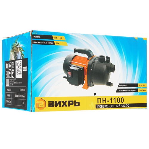 Поверхностный насос Вихрь ПН-1100 предназначен для подачи под давлением чистой воды в дом, для орошения сада и огорода. Вода не должна содержать абразивных или волокнистых, а также химических составных частей, которые могли бы повредить материал деталей насоса. Модель оснащена центробежным насосом, что обуславливает высокий напор при небольшой входной мощности. Мощность насоса составляет 1100 Вт, этого хватает для поднятия воды на высоту 50 метров, при этом производительность составит 70 литров в минуту. Корпус насоса выполнен из пластика, переходный фланец - алюминиевый. В конструкции предусмотрено плоское основание для прочной и надёжной установки.