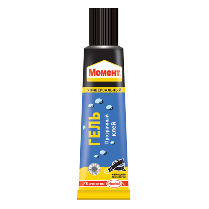 Момент Гель- прозрачный гелеевый клей, не оставляющий заметных следов. Предназначен для работы с пористыми и впитывающими материалами. В различных сочетаниях склеивает дерево, металл, резину, бумагу, картон, кожу, ткань, пробку, поролон, фарфор, керамику, стекло, кроме посуды, конактирующей с пищей.