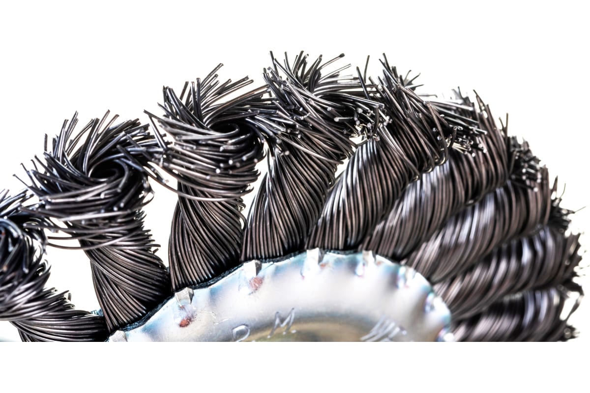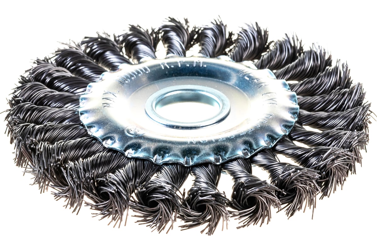 Щетка для УШМ 125мм, посадка 22,2 мм Плоская крученая проволока 0,5мм Сибртех является сменным элементом для угловых шлифмашин и применяется для шлифовки, зачистки от лака, краски, грязи и коррозии различных поверхностей и изделий. Рабочая часть состоит из скрученной в пучки стальной проволоки. Специальная форма щетки в виде диска и упругие плетеные пучки позволяют работать в труднодоступных местах.