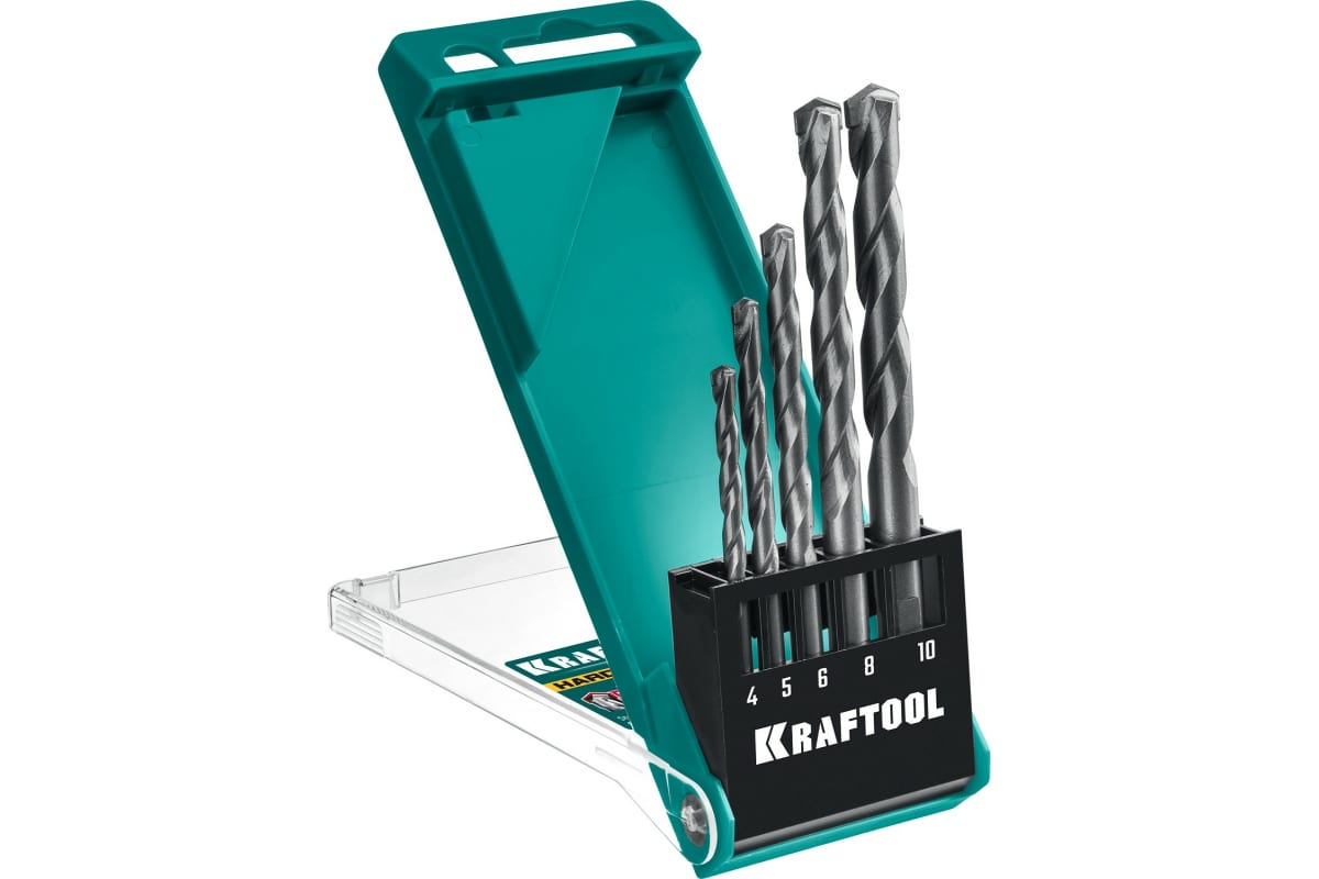 Набор сверл по твёрдым материалам 4-5-6-8-10 5шт KRAFTOOL HARD подходит для сверления быстрорежущих сталей, подшипниковой стали, чугуна, керамики, гранита, а также бетона и кирпича.