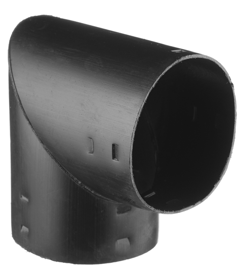 Отвод представляет собой пластиковый элемент в виде угла со специальными фиксирующими выступами с внутренней стороны, обеспечивающими надежное соединение. Предназначен для создания поворота дренажной системы под углом 90º.